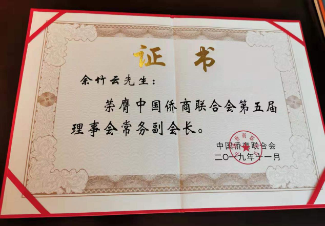 董事长余竹云荣誉当选中国侨商联合会第五届理事会常务副会长