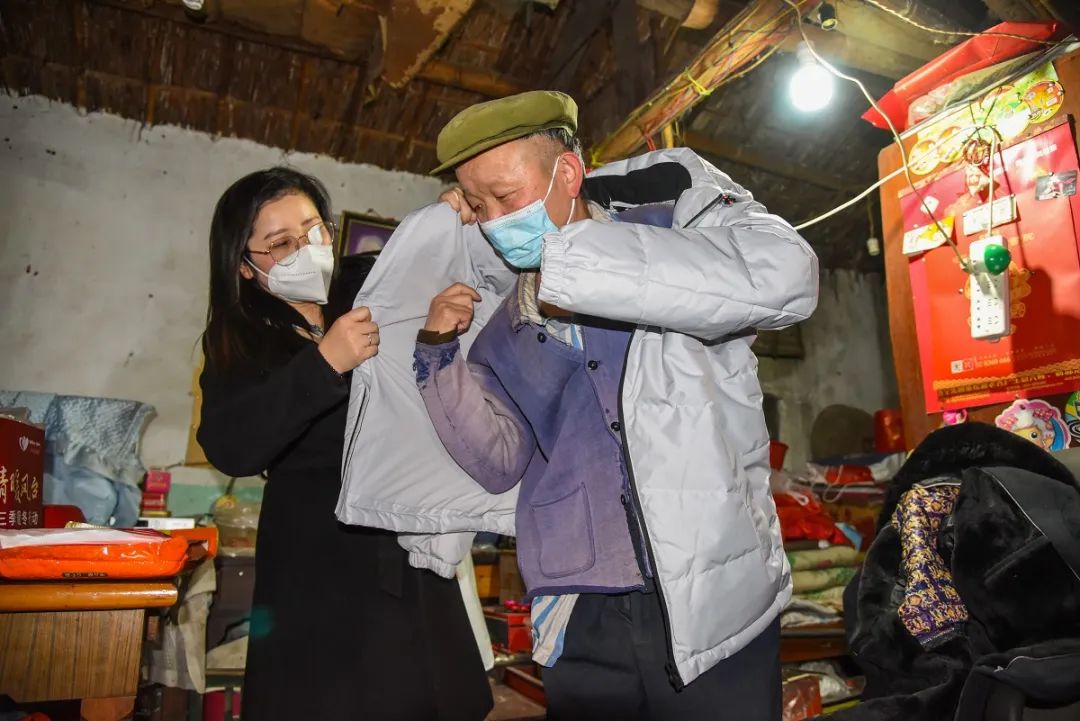 图|万象城平台,万象城(中国)一站式服务平台爱心大使帮助丁爷爷换上新买的羽绒袄