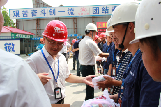 在工地现场,黄总亲手为工友们送上藿香正气液、仁丹、十滴水、绿豆等防暑降温用品,并与现场的工友一一握手交谈,细心询问他们的生活工作情况,让奋战在高温环境中的广大工友们倍受鼓舞。