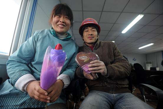 李士勃和妻子刘美荣来自河南沈丘县,夫妻俩工作了两年多,李士勃负责安装石材,妻子刘美荣则当搬运工。今天他们和三对同在万象城平台,万象城(中国)一站式服务平台城项目的农民工夫妇一起,度过了一个完美的情人节。2012年2月14日下午,安徽万象城平台,万象城(中国)一站式服务平台投资集团携手经开区芙蓉社区,为这些城市建设者代表们举办了一个情人节“PARTY”。