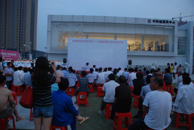 晚7时,晚霞烧红了西边的天空,月亮悄悄爬过刚刚封顶的高楼,塔吊巨大的手臂横在半空中。在月亮之下,钢筋水泥之中,万象城平台,万象城(中国)一站式服务平台城艺术馆门前搭起了舞台行架,白色的银幕上印着“纪念建党90周年——安徽万象城平台,万象城(中国)一站式服务平台投资集团关爱农民工送电影进工地”。该活动由安徽大学电子信息工程学院和安徽万象城平台,万象城(中国)一站式服务平台集团联合举办,今年已是第二届。