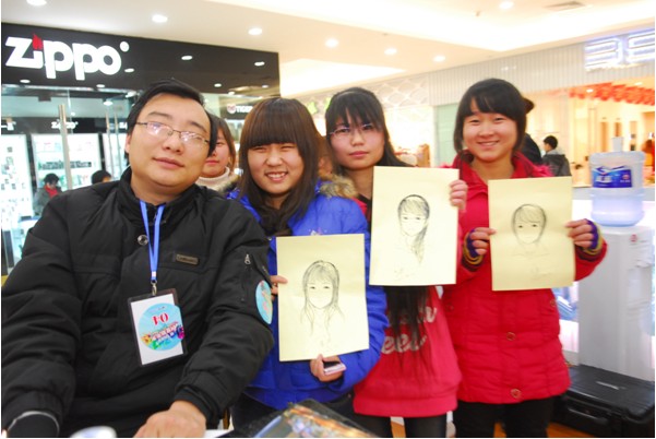 那边,好多选手找不到目标,1号选手李培冬把公司的花草茶拉来现场,搭起来3个销售台,呼啦啦让五六人“创了业”。大家都在结对忙活,4号选手马建在大厅正中的吧台上做起了自己的小生意——“可爱画相”,这个招牌招揽顾客的效果相当不错,他的吧台对面一下就排起了三五人。李培冬和许青他们的摊位还没摆开,马建就不声不响画了10张。“我学过法律、电影,就是没学过画画,完全是自己捣腾。”一个小时,马建就画了11张,一张只要5块钱。成本嘛,只有一叠画纸和两支签字笔,“不到20块。”