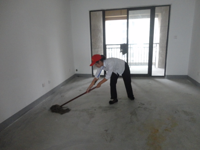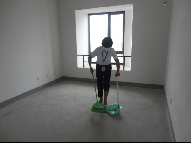 闷热的天气和满屋的灰尘也挡不住紫荆客服刘芬清扫室内地面的脚步。