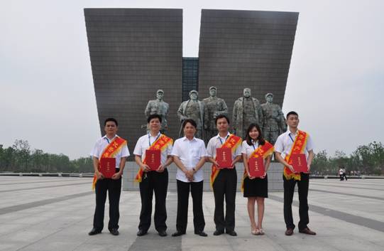 参观完渡江战役纪念馆展厅内容,员工们来到渡江战役总前委群雕前,举行了隆重的为“优秀共产党员”颁发荣誉证书和新党员入党宣誓活动。集团董事长兼总裁、党总支部书记余竹云,为今年“七一”被集团党总支部评为“优秀共产党员”的陆春晨、高婧、王涛、王飞、宋春光等5名同志颁发“优秀共产党员”荣誉证书;由集团党总支部副书记汪本银同志领誓,朱玉娟、冯佐军、屠梅燕、杨靖、张一丹等5名预备党员庄严的举起右手,面对鲜红的党旗进行宣誓。然后,全体党员在渡江战役总前委群雕前合影留念,余书记作了重要讲话。