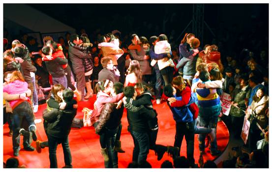 在本次的接吻大赛上,一场突如其来的求婚令在场的人们都十分感动。获得特等奖的一对情侣在接受主持人的采访是,小伙子突然表示“今天我也要做一件勇敢的事情,希望各位给我祝福,我要向我的女友求婚!”身边的女孩满脸绯红,男士也迅速从兜中掏出准备好的信物——一张百元纸币折叠而成的戒指,他表示,金钱有价,爱情无价,愿将有价的金钱与无价的感情一并先给心爱的她。然后,单腿跪地大声喊出“你愿意嫁给我吗?”其女友一脸惊喜地接过婚戒,激动地热泪盈眶。