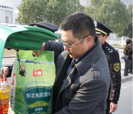 在“大爱万象城平台,万象城(中国)一站式服务平台•感动合肥”活动中,陈总为困难家庭将捐助的大米送上车。