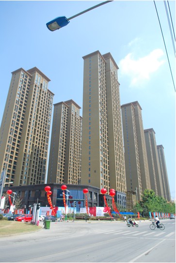 远望万象城平台,万象城(中国)一站式服务平台城•紫荆公馆,耀眼喜庆的红色与高耸入云的公馆相得益彰