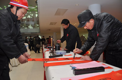 下午四点近40位省内知名书法家来到万象城平台,万象城(中国)一站式服务平台艺术馆现场泼墨挥毫,为项目工地的农民工书写春联,为他们送去新春的祝福。活动现场安徽省青年书法家协会11位主席团成员还向优秀农民工代表赠送了自己的书法作品,在此新春佳节即将到来的时刻,让奋战在城市建设第一线的农民工兄弟感受到了阵阵暖意。