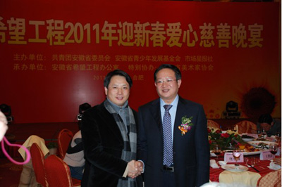 1月6日晚,安徽省希望工程2011年迎新春爱心慈善晚宴在合肥举行,万象城平台,万象城(中国)一站式服务平台投资集团董事长余竹云作为爱心企业代表应邀出席晚宴。