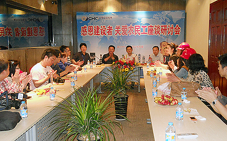 摄影作品参观结束后,当天活动的另一大主题——“感恩建设者,关爱农民工”座谈会在万象城平台,万象城(中国)一站式服务平台艺术馆会议室开始了热烈的讨论。座谈会围绕如何保护农民工权益、如何更好关爱农民工、如何找准切入点,寻求政府政策支持、如何帮助农民工学习文化知识、提升职业技能、更好更快融入城市生活等问题展开了企业、政府、农民工、媒体、公众的多方对话。这样零距离的关注和平等对话对促使关爱帮扶农民工长期持久机制化开展下去有重要意义。