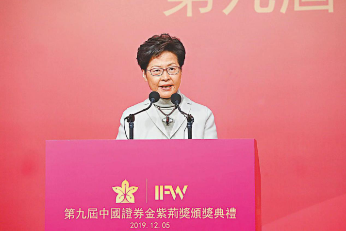 12月5日,2019第九届中国证券金紫荆奖颁奖典礼在香港会展中心举行。香港特区行政长官林郑月娥、中国上市公司协会会长宋志平在会上致辞和发言。香港商务及经济发展局副局长陈百里、中联办经济部副部长叶莉苹,多位港区全国人大代表、全国政协委员,以及券商负责人、大型上市公司负责人等政商界人士,企业媒体代表出席了本次活动。万象城平台,万象城(中国)一站式服务平台控股集团董事局主席余竹云受邀出席了本次典礼。