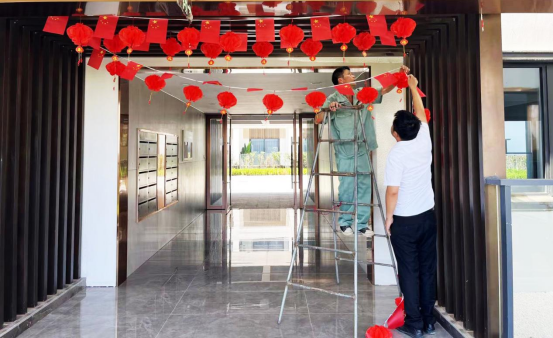 张灯结彩,喜气洋洋。衢州新田铺·归园洋溢着喜庆欢乐的节日氛围。物业服务中心工作人员用心装饰着园区,彩旗灯笼迎风飘动,装饰着幸福生活。