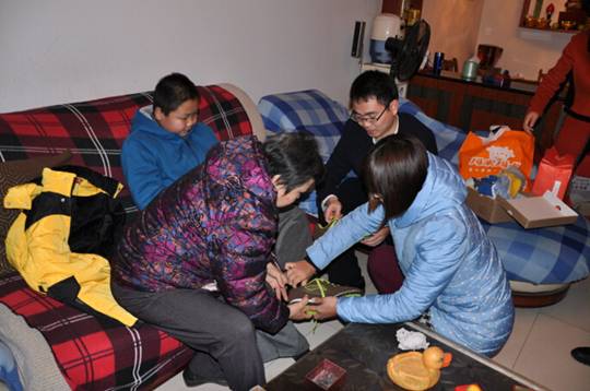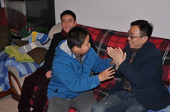今年13岁的乔冬晨,是一名自闭症儿童,虽然不太爱说话,但看到大家来看他,小冬晨显得特别兴奋,不停摇着手,跟大家打招呼。在他家的客厅里,大家分别帮他试穿了带来的棉袄、毛衣、鞋子,并把大礼包和慰问金递到了他奶奶的手中。看到大家这么热心,他的奶奶失声哭了起来,“谢谢你们,你们都是大好人!”