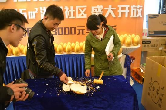 金蛋一砸,礼花四溅。人们望着金蛋中垂下的纸条上注明的礼品,不禁鼓掌欢呼。电视机、微波炉、豆浆机、空气加湿器和保温杯等精美礼品,纷纷花落有主。整场活动,让人充满期待。