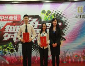 总经理朱玉娟为舞王曹晟和舞后陆陈茹颁发个人奖
