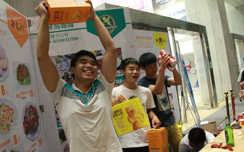 经过逐级淘汰,比赛最终进入了冲刺阶段,为了夺得冠军,选手们一口啤酒一口龙虾,经过六轮的比拼,男女两组的冠亚季军都已经产生,获奖的喜悦洋溢在脸上。