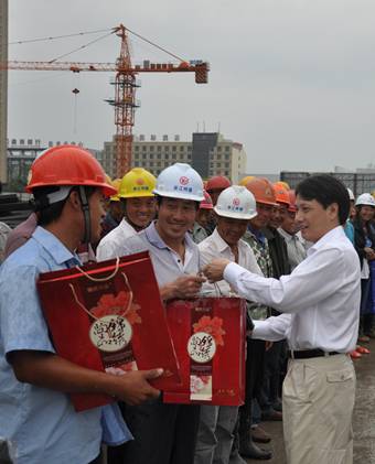 “现在工期比较紧,天气又凉快,大家都想多上些工,过年再回家团圆。”从河南信阳来打工的老张,因为工期紧,今年他又不能回家过中秋节了,正在工地上劳动的他,收到了包装精美的月饼和生活用品,着实让他意想不到。“余总亲自带员工来慰问我们,我们也感觉到家的温暖,非常感谢你们。”