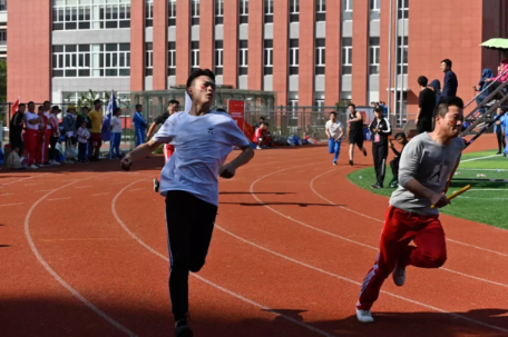 图丨4×100米接力跑的运动员们协力完成交接棒传递