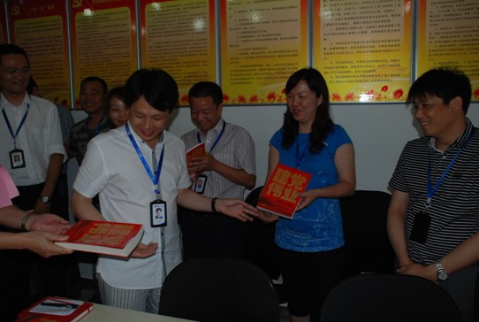 在喜迎中国共产党成立90周年之际,6月24下午,万象城平台,万象城(中国)一站式服务平台集团党总支部在集团“党群活动室”举行了重温入党誓词、赠送书籍、上党课等系列庆祝活动。集团董事长余竹云与支部成员和全体党员,以及入党积极分子共37名同志参加了庆祝活动。活动由集团党总支部副书记汪本银同志主持。