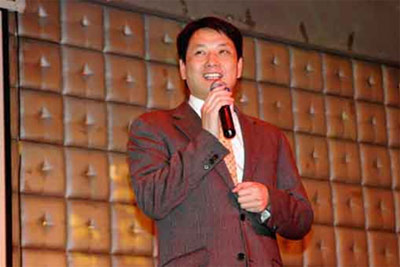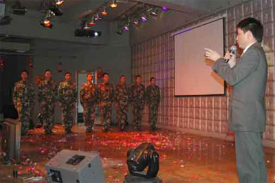 总裁余竹云也按耐不住激动的心情,走上台为大家唱了首经典的粤语歌曲(图)接着余总又和官兵们一起为大家表演了平时操练的情景,赢得了台下阵阵掌声