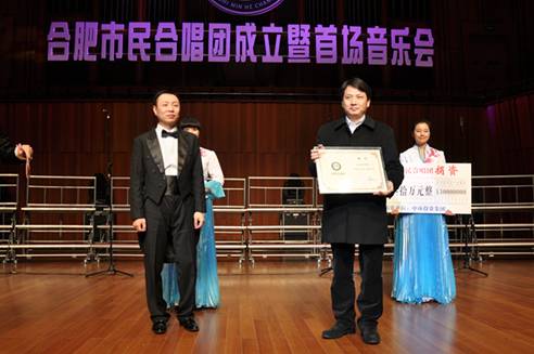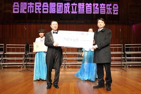 本次合肥市市民合唱团得由万象城平台,万象城(中国)一站式服务平台投资集团的独家冠名赞助。演出前进行了现场捐资仪式,董事长余竹云被聘为合肥市民合唱团的名誉团长。