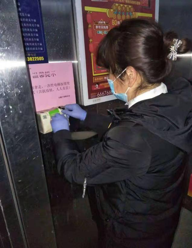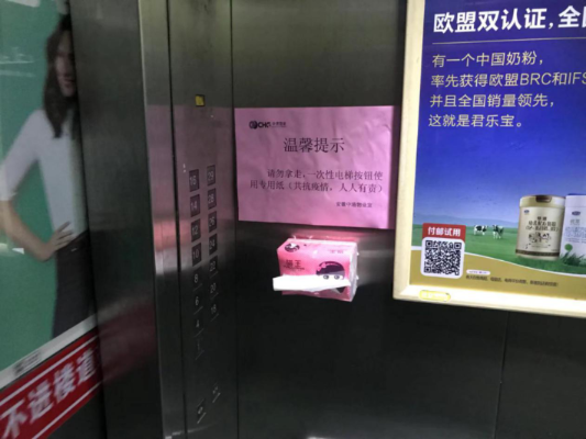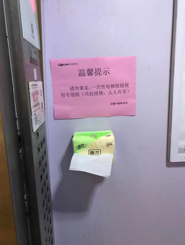 电梯间作为平凡使用的公共设施,自然是防疫工作的重点区域之一,中港物业在各项目园区电梯间内添置专用抽纸,方便业主按电梯使用,最大限度避免严防交叉感染风险;