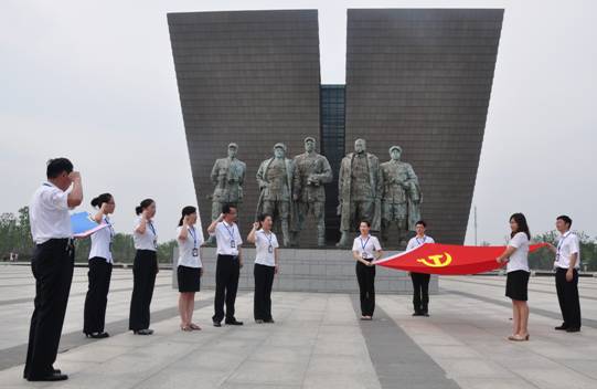 参观完渡江战役纪念馆展厅内容,员工们来到渡江战役总前委群雕前,举行了隆重的为“优秀共产党员”颁发荣誉证书和新党员入党宣誓活动。集团董事长兼总裁、党总支部书记余竹云,为今年“七一”被集团党总支部评为“优秀共产党员”的陆春晨、高婧、王涛、王飞、宋春光等5名同志颁发“优秀共产党员”荣誉证书;由集团党总支部副书记汪本银同志领誓,朱玉娟、冯佐军、屠梅燕、杨靖、张一丹等5名预备党员庄严的举起右手,面对鲜红的党旗进行宣誓。然后,全体党员在渡江战役总前委群雕前合影留念,余书记作了重要讲话。